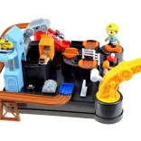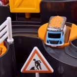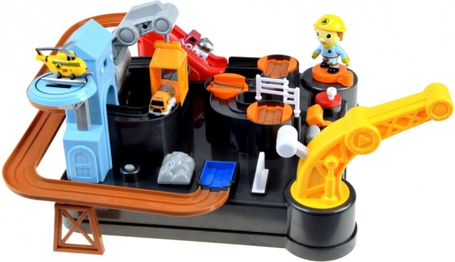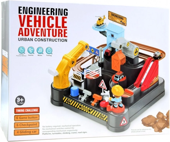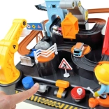 - Piste avec obstacles, grue avec aimant, ascenseur, 3 petites voitures de chantier, hélicoptère, figurine de constructeur, tour avec horloge numérique