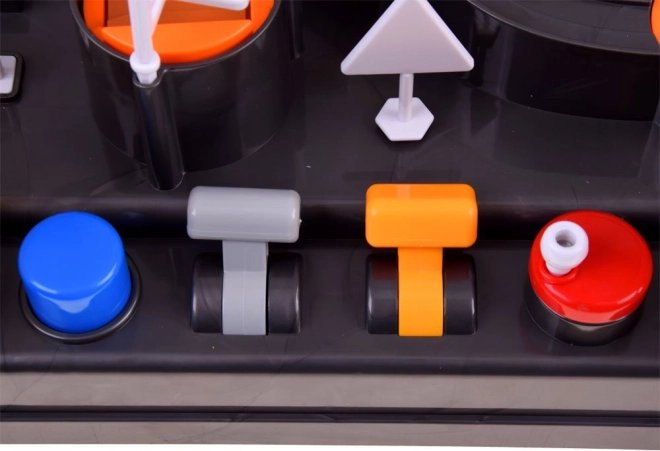 - Éléments interactifs: plateau tournant orange et rouge, levier jaune de l’ascenseur, levier gris avec signalisation, bouton bleu pour lancer la petite voiture vers la grue.