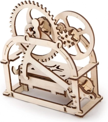 La boîte mécanique UGEARS associe matériau traditionnel et mouvement ingénieux. Grâce à un système d’engrenages astucieux, il suffit d’appuyer sur le levier latéral pour que le couvercle s’ouvre avec un clic agréable. L’emballage comprend deux variantes de panneau avant – avec découpe ou plein – selon l’usage prévu.