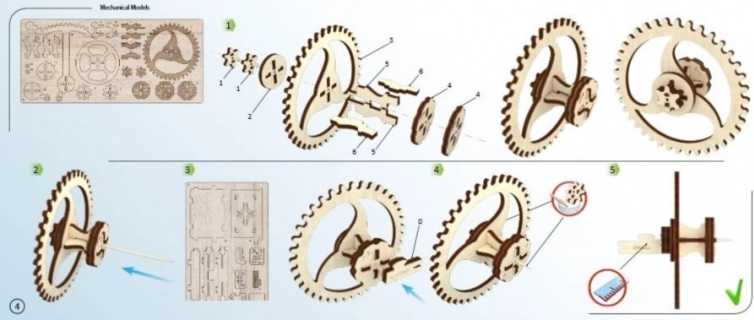 Des pièces en bois découpées avec précision, un mode d’emploi illustré clair et le cirage recommandé des axes assurent une rotation fluide et un fonctionnement sans problème.
