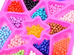 Les perles sont triées par couleur dans des compartiments séparés, ce qui permet une sélection et une utilisation faciles.