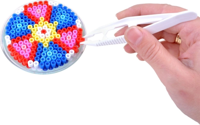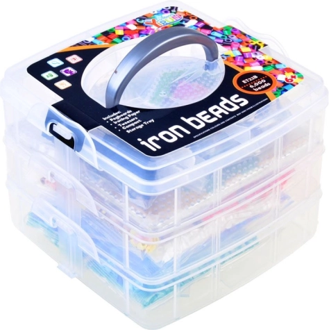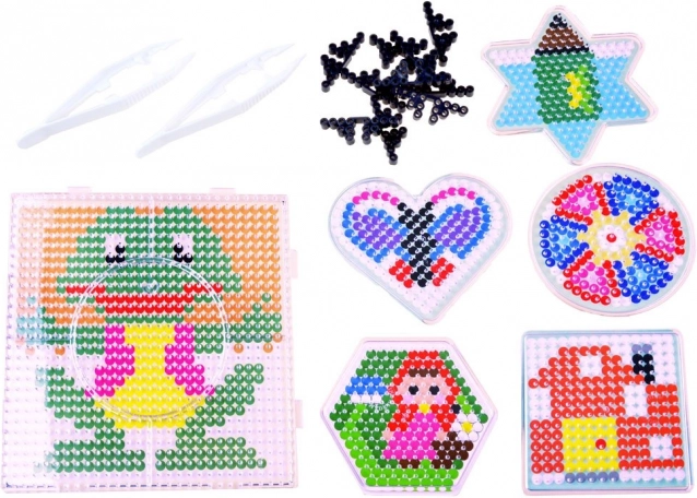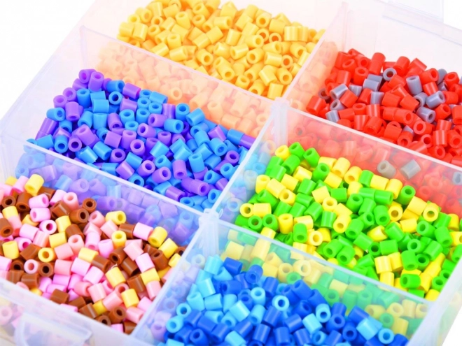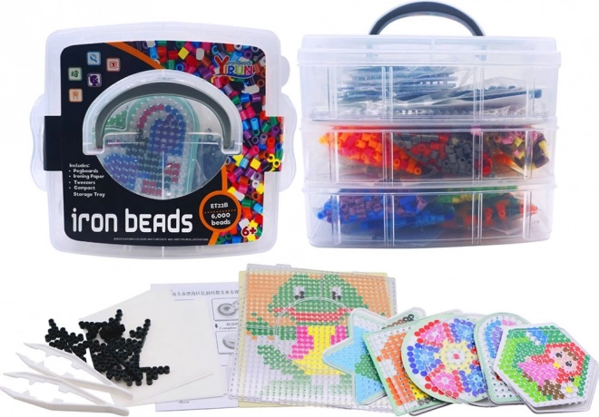 - env. 6000 perles à repasser, 6 modèles, 10 plaques, 12 sachets de perles de différentes couleurs, 2 pinces, 2 feuilles de papier sulfurisé, boîte de rangement à compartiments