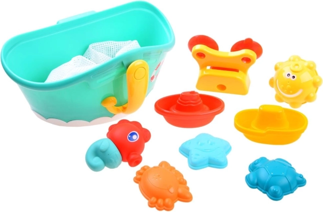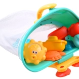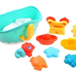 Les principaux composants du set incluent des bateaux en plastique, des animaux marins avec des ouvertures pour effets spéciaux, un cheval de mer en caoutchouc pour les jeux aquatiques et un soleil souriant jaune pour verser de l'eau. Le set est conçu pour les enfants à partir de 12 mois, avec toutes les pièces dimensionnées pour leurs petites mains.