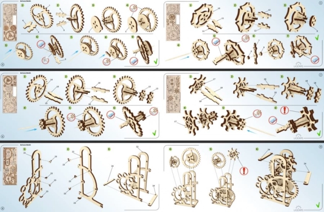 Les pièces découpées avec précision s’emboîtent parfaitement. Pour un frottement minimal, il suffit, selon le mode d’emploi, de lubrifier les axes avec de la cire de bougie ordinaire.