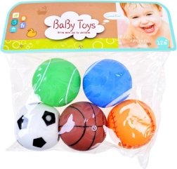Ce set varié comprend cinq balles en caoutchouc colorées inspirées de sports populaires : football, basket-ball, tennis, base-ball et football américain. Grâce à l’insert sifflant intégré, un son amusant se fait entendre lorsqu’on appuie, éveillant la curiosité des enfants et développant leur motricité fine.