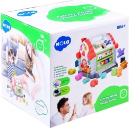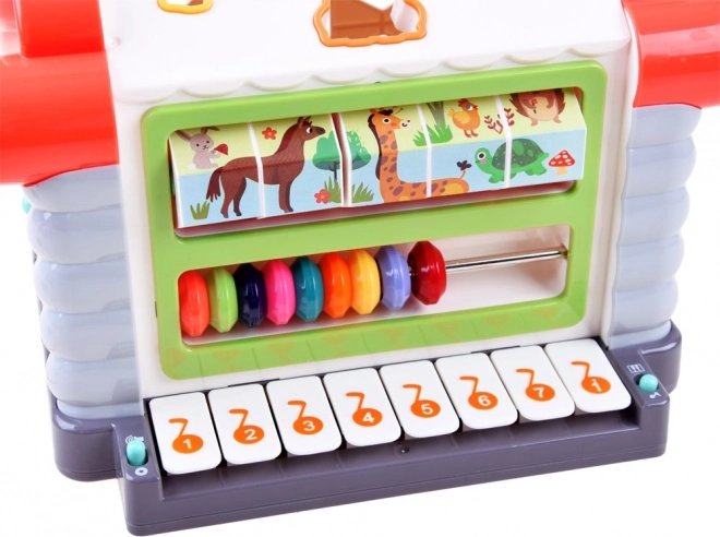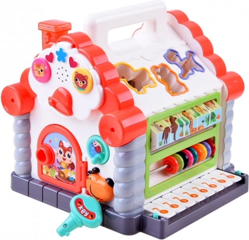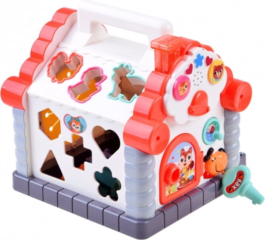 Cette maison de découverte est fabriquée en plastique de qualité, résistant, aux couleurs attrayantes. Elle propose de nombreuses fonctions interactives : après l’insertion correcte d’une pièce, le son de l’animal correspondant se fait entendre, le mini clavier joue la gamme et 7 mélodies populaires, et l’abaque encourage les premiers apprentissages du comptage. Grâce à la clé et aux petites portes, les enfants entraînent la motricité fine et la coordination œil–main.