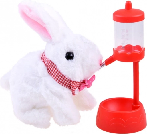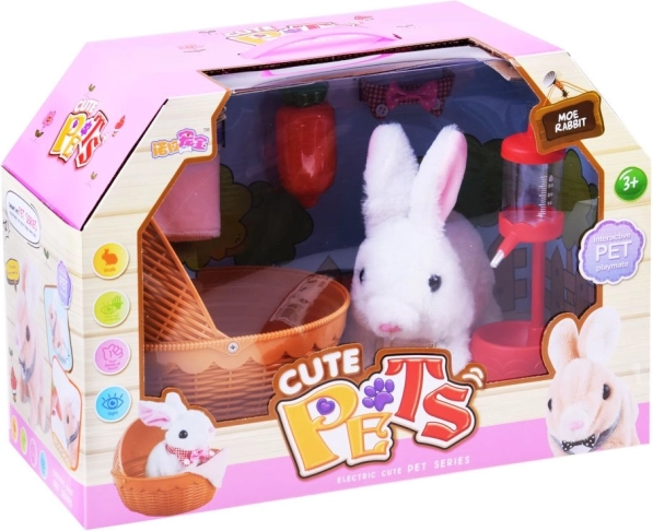 Un adorable petit lapin blanc aux oreilles roses ravira chaque enfant. Après insertion des piles, le lapin avance, remue drôlement son petit nez et émet des sons de lapin. Sont inclus un panier avec couverture, une carotte et un biberon/boîte à boisson pour des soins réalistes du petit animal.