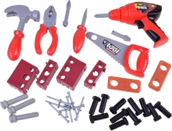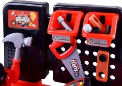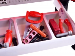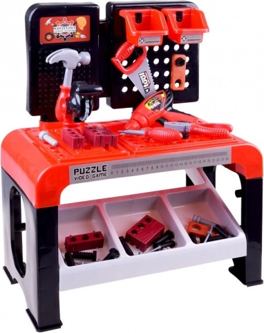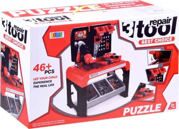 Le set comprend un établi avec étagères et surface de travail. Il est également équipé d’une scie à main, d’un tournevis avec embouts interchangeables, d’un marteau et d’une pince. Le set contient aussi diverses vis, écrous et plaquettes en bois percées. Le tout est rangé dans une boîte pratique offrant une organisation facile des pièces.