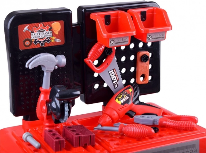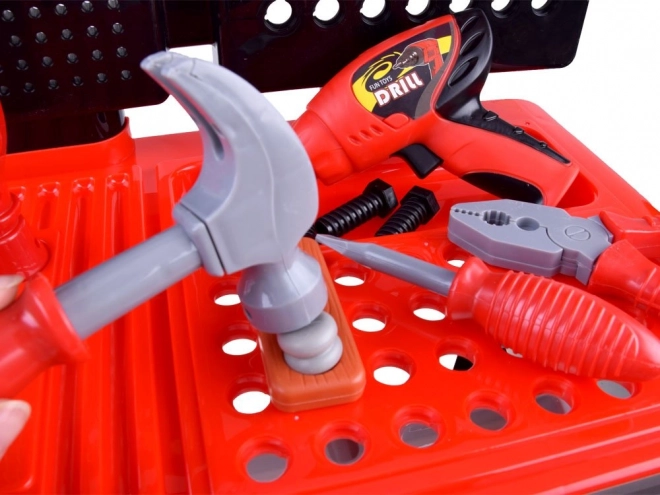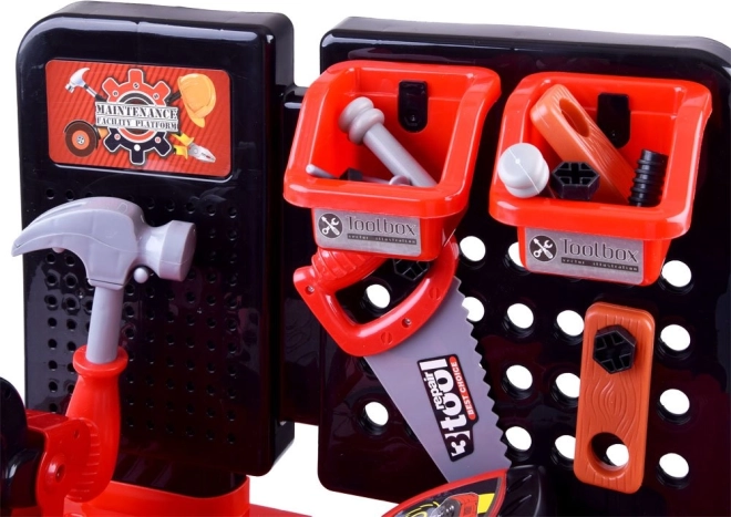 L’ensemble contient tous les outils nécessaires aux réparations pour enfants, y compris une scie, un tournevis et un petit marteau.