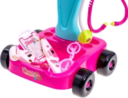 - Chariot médical avec panneau, lunettes, stéthoscope avec lumière, thermomètre avec réglage et rétroéclairage, otoscope avec lumière, tensiomètre avec réglage et rétroéclairage, marteau neurologique, seringue, miroir avec lumière, 2× ciseaux, scalpel (jouet), bol, imitation de crème désinfectante, gouttes pour les yeux (imitation), boîte à médicaments (imitation), badge du médecin, carte du patient