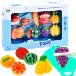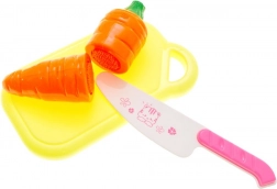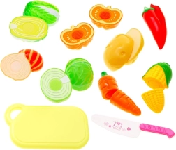 Comprend une planche, un couteau et un assortiment coloré de légumes pour des jeux de cuisine créatifs.
