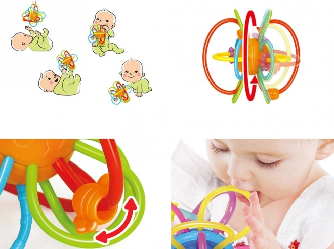 Le jouet peut être utilisé à la maison comme en déplacement – il est léger, résistant et facile à nettoyer à l’eau tiède. Parfait pour faire rouler, lancer ou accrocher au lit ou à la poussette, où il divertit et apaise le bébé.