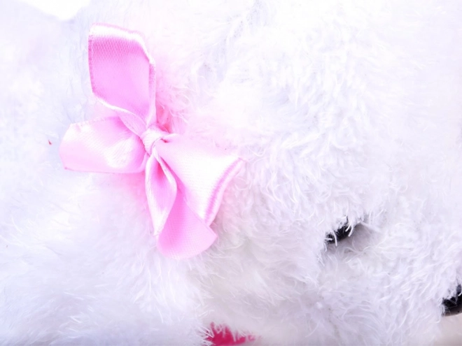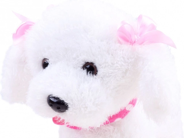 Grâce à son matériau doux et moelleux, le chien est parfait pour les câlins. Le collier coloré et les petits nœuds donnent au jouet un look adorable que les enfants adorent rapidement. Idéal pour jouer à la maison sur des surfaces planes.