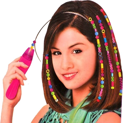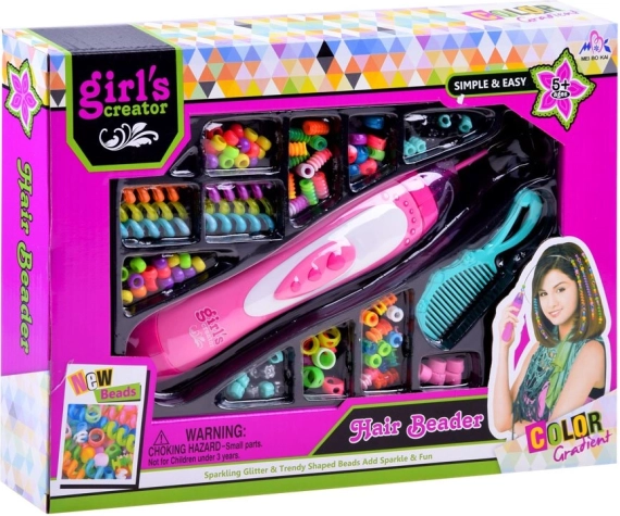 Diverses formes et couleurs de perles, perles à clip, spirales colorées et peigne permettent de créer une infinité de coiffures.