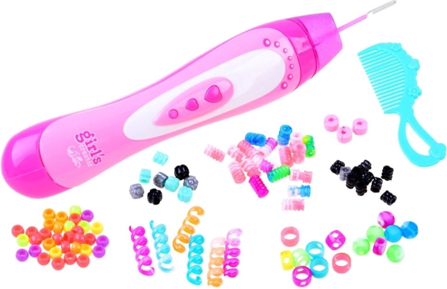 L’enfileur intuitif permet aux enfants d’orner leurs mèches en quelques secondes – sans procédure compliquée et sans aide d’adultes.