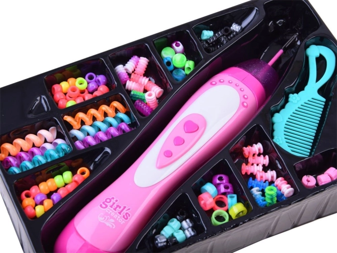 Découvrez une décoration capillaire simple et ludique avec ce kit Girl's Creator. L’enfileur ergonomique vous aide à fixer rapidement des perles sur les mèches choisies, afin que les enfants puissent créer eux-mêmes en toute sécurité des looks colorés au quotidien. Il suffit de préparer une mèche, de verser les perles dans le réservoir et, d’une légère pression, de les enfiler l’une après l’autre.
