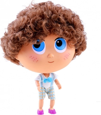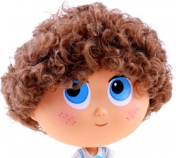 De grands yeux bleus, de délicates taches de rousseur et des cheveux bruns bouclés donnent à la poupée un caractère unique et un sourire amical.