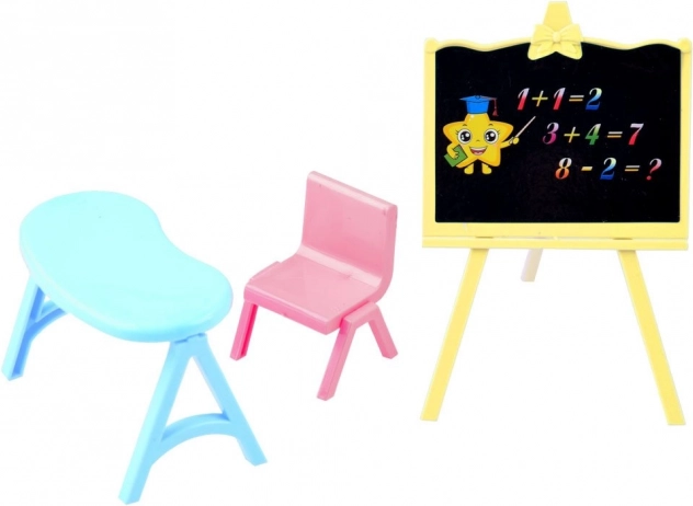 Équipement complet pour jouer à l’école. Les enfants peuvent écrire sur le tableau, asseoir la poupée au bureau et créer leurs propres leçons.