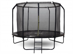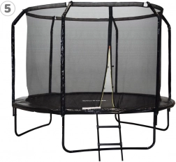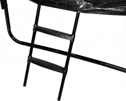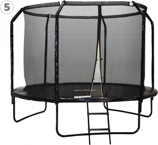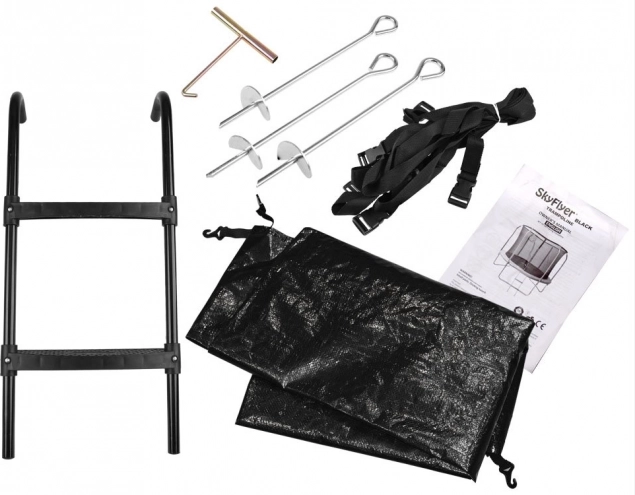 Le colis comprend tout le nécessaire : cadre avec tubes peints en noir, échelle pour un accès confortable, couvre-ressorts (pad), ressorts oxydés robustes, housse imperméable et des accessoires pratiques, dont une clé de traction pour ressorts. Grâce à une conception bien pensée (vis placées à l’intérieur), le pourtour extérieur est lisse et sûr.