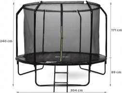 Le modèle SKYFLYER 10 ft (304 cm) est un ensemble de trampoline de jardin complet pour toute la famille. Le filet intérieur avec fermeture éclair et boucle, les pieds en U pour la stabilité et la toile de saut cousue 8 fois en polypropylène robuste offrent une grande durabilité et un saut en toute sécurité. Le montage est simple et, grâce aux ancres et aux sangles, le trampoline reste bien en place même par vent plus fort.