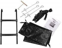 Le pack comprend une échelle à deux marches pour un accès facile, des ancres avec sangles pour la fixation, et une bâche imperméable pour la protection contre les intempéries.