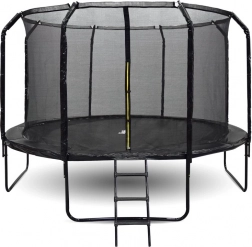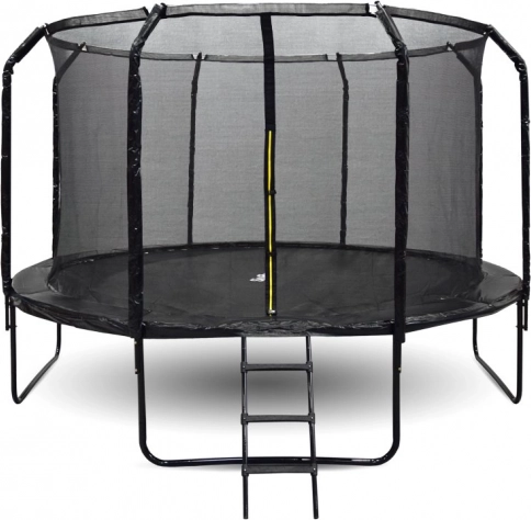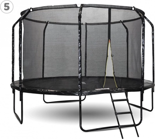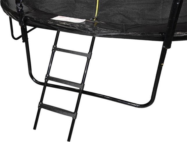 Le cadre massif avec ressorts oxydés puissants et pieds en U maintient le trampoline fermement en place, tandis que le couvre-ressorts protège efficacement les ressorts. La structure à trois marches facilite la montée, même pour les enfants. Le colis comprend également des ancres avec sangles, une housse imperméable et des outils de montage – tout pour une installation aisée et une utilisation sans souci.