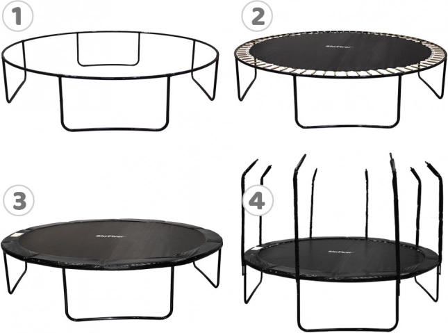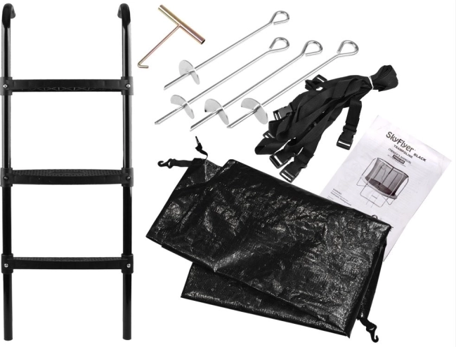 - Échelle, filet de protection, corde de fixation du filet, ancres avec sangles, housse imperméable, protège-ressorts, crochet pour ressorts, notice de montage