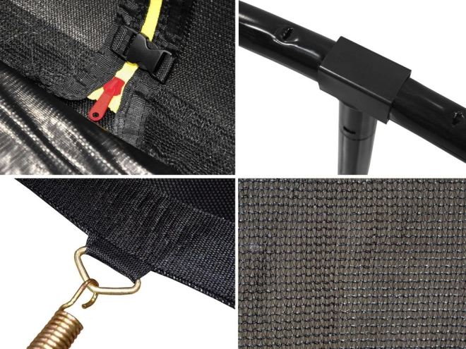 Le filet de protection haut, tendu par un anneau, conserve sa forme; l’entrée est sécurisée par un zip et une boucle. Les montants métalliques profilés sont dotés d’un rembourrage souple pour des sauts en toute sécurité.