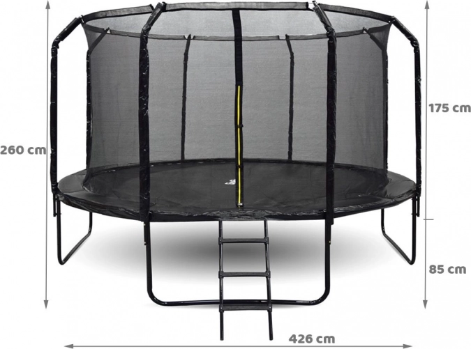 Profitez d’un divertissement actif pour toute la famille avec la trampoline de jardin SkyFlyer 426 cm équipée d’un filet de protection et d’une échelle à trois marches. Sa structure stable avec poteaux profilés, sa surface de saut en PP résistante et la double sécurisation de l’entrée garantissent des sauts en toute sécurité, même en cas d’utilisation intensive.