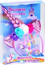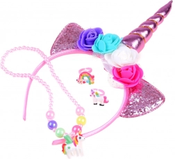 Créez une tenue magique en un instant. Le serre-tête licorne est entièrement recouvert de satin doux qui protège la peau délicate des enfants des irritations. La corne rose souple remplie de mousse garde sa forme, les petites oreilles scintillantes et les fleurs multicolores apportent une touche féerique. L’ensemble est complété par un collier coloré en perles avec pendentif licorne et deux bagues.