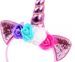 Une corne en mousse souple, de petites oreilles scintillantes et des fleurs colorées créent un look licorne unique pour chaque fête.