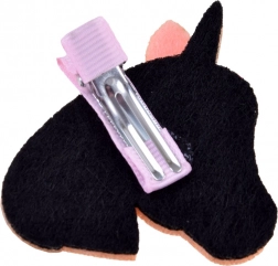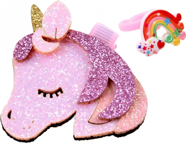 Un clip brillant en forme de tête de licorne maintient les cheveux en place tout en ajoutant une note ludique et féerique.