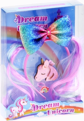 Un ensemble d’accessoires pour cheveux stylé et coloré qui crée un look de conte de fées en un clin d’œil. Le serre-tête avec revêtement satiné doux est confortable à porter et orné d’un nœud scintillant aux couleurs de l’arc-en-ciel avec motif de poneys. Le set est complété par une barrette licorne brillante et une adorable bague en plastique arc-en-ciel qui apportent une touche ludique à la tenue.