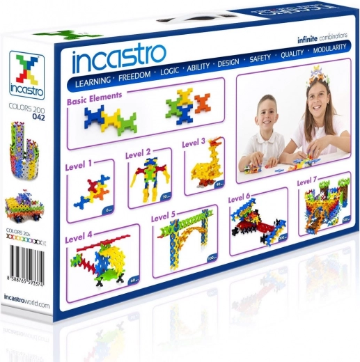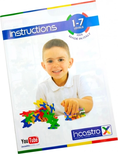 INCASTRO est un jeu de construction ingénieux fabriqué en Italie qui, grâce à la forme étudiée de ses pièces, offre des possibilités presque illimitées. Avec quelques éléments, composez facilement des motifs plats, des tours, des véhicules, des animaux et même des modèles fonctionnels. Les pièces s’emboîtent avec précision et les structures restent solidement assemblées.