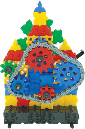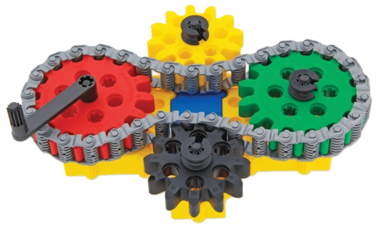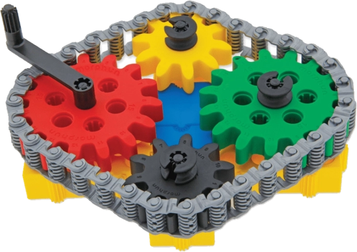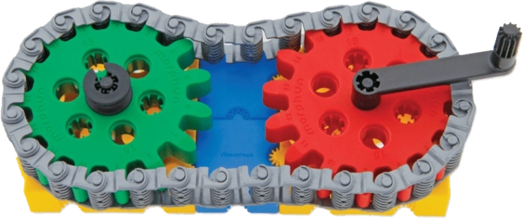 Les enfants comprennent facilement la mécanique du mouvement : ils connectent les roues dentées, la chaîne et la manivelle et voient tout le mécanisme s’animer.