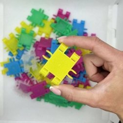 Les pièces sont fabriquées en Belgique en polypropylène de haute qualité, résistant aux rayures et aux intempéries. Le jeu est compatible au sein de la gamme CLICS et répond aux strictes normes de sécurité de l’UE et des États-Unis. Le jeu développe naturellement la patience, la concentration, le tri et la catégorisation ainsi que la représentation spatiale.