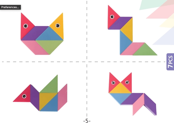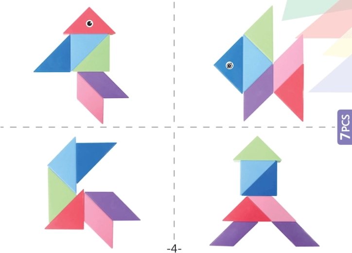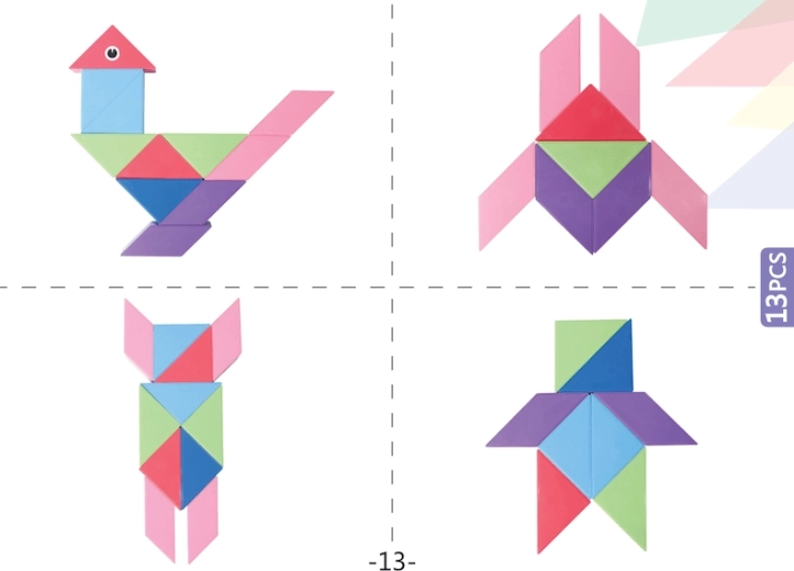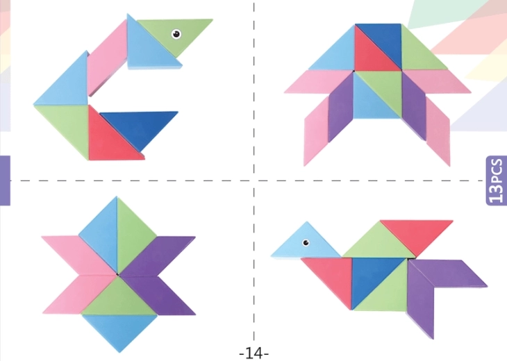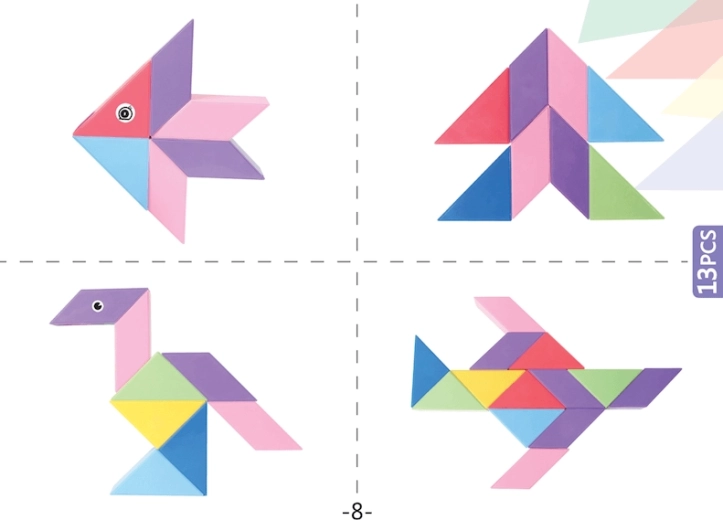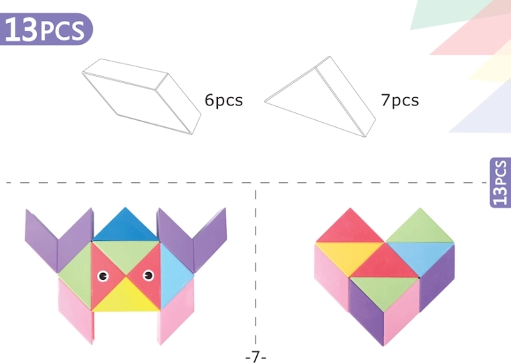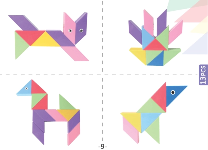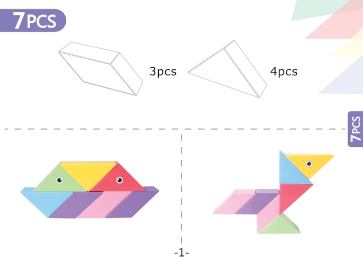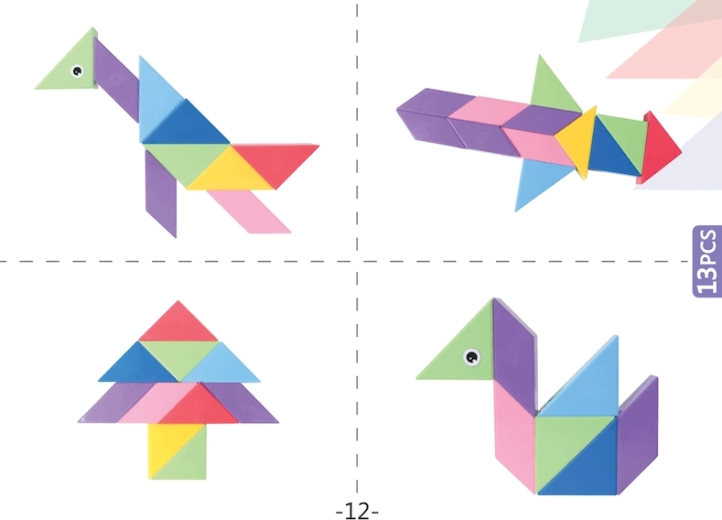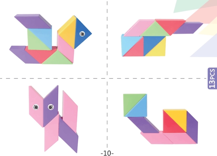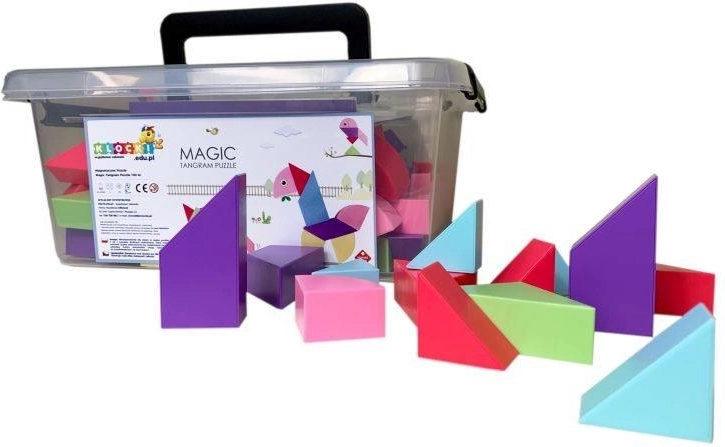 Le Tangram magnétique combine le puzzle chinois traditionnel avec des éléments modernes. Grâce aux aimants utilisés, la construction est plus simple, les modèles sont plus solides et permettent de créer des structures en volume. Avec ce kit, vous pouvez non seulement créer des formes impressionnantes, mais aussi réaliser des activités mathématiques comme le tri des formes et des couleurs ou l’apprentissage de l’addition et de la soustraction. L’ensemble comprend également des autocollants pour les yeux et la bouche, qui donneront de la personnalité à vos modèles.