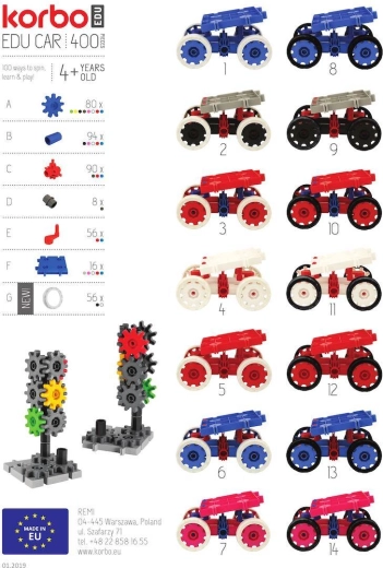 Découvrez le monde créatif de la construction avec le jeu éducatif KORBO Edu Car 400. Ce grand set avec 400 pièces et 56 pneus développe la pensée logique, la motricité fine et la créativité des enfants dès 4 ans. Grâce aux engrenages et aux éléments mobiles, construisez des voitures, chariots, motos ainsi que des éléments d’infrastructure routière dont un feu tricolore, et exercez en jouant les règles de circulation.