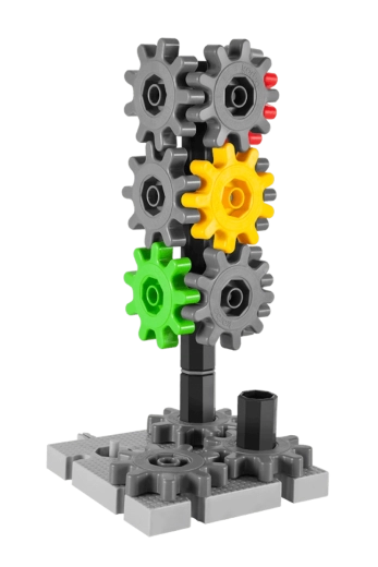 Les engrenages reliés donnent du mouvement aux constructions. Construisez des voitures, des chariots ou un feu tricolore et découvrez les bases de la mécanique en jouant.