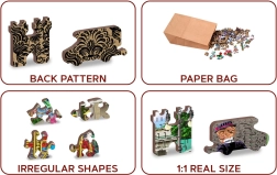 Ne manquez pas l'occasion de découvrir la beauté des pièces aux formes uniques de notre puzzle WOODEN CITY. Chaque pièce est découpée au laser, et certaines sont sous forme d'animaux, de bâtiments ou d'objets, ce qui augmente la valeur esthétique du résultat. Les puzzles sont réversibles, vous pouvez donc les assembler selon la photo ou le motif de l'autre côté.