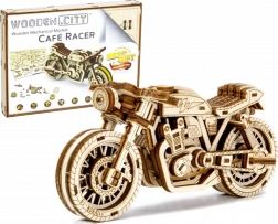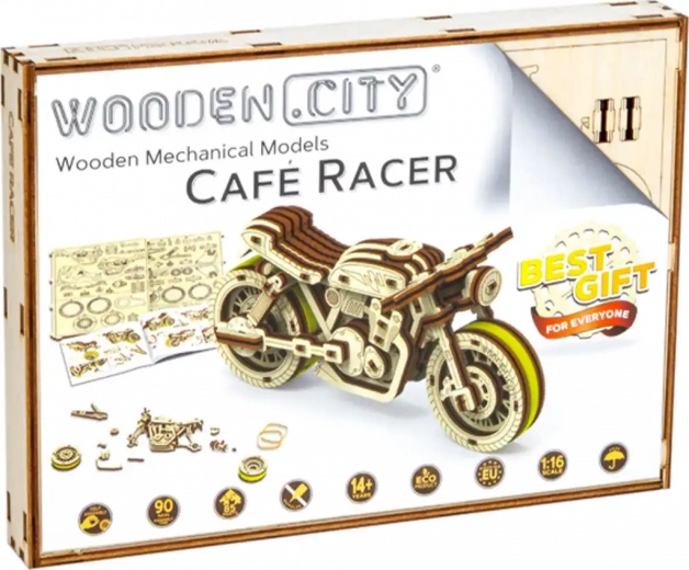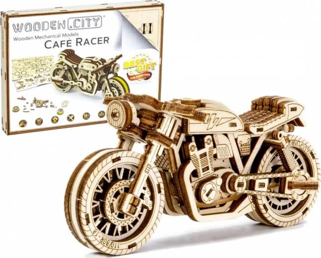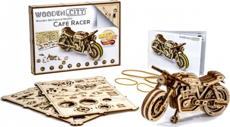 La moto Café Racer de WOODEN CITY est un modèle en bois minutieusement conçu à l’échelle 1:16, qui donnera vie à votre bureau ou vitrine. Grâce au moteur à élastique et au mécanisme de rappel, le modèle se déplace en avant et en arrière, atteint environ 1 mètre et offre une vue sur la mécanique réelle des engrenages.