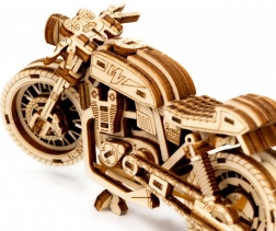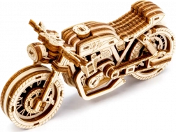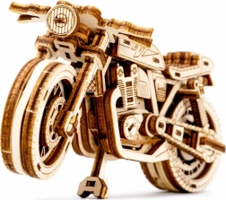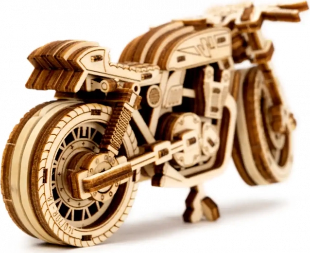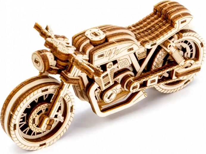 Construisez une élégante moto Café Racer en contreplaqué naturel et profitez de sa mécanique fonctionnelle. Grâce à la marche arrière et au moteur à élastique, le modèle parcourt jusqu’à 1 mètre, dispose de roues caoutchoutées, d’un mécanisme à volant d’inertie et de commandes réalistes. Le montage se fait sans colle ni outils et l’emballage sert de support.