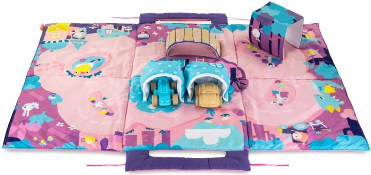 Transport facile - une fois pliées, les petites voitures peuvent être rangées dans les poches (garages) et, grâce aux poignées, l’ensemble du tapis se transporte facilement et confortablement.