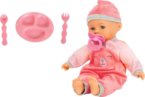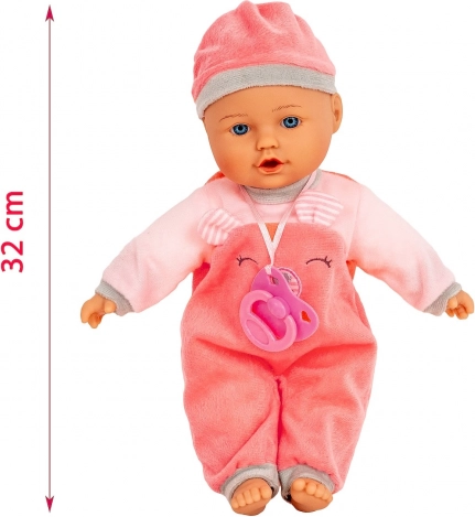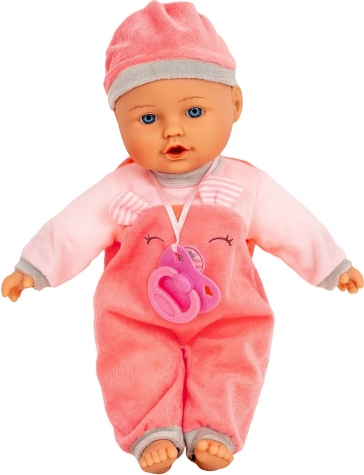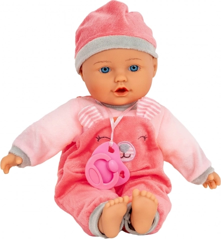 La poupée Julka ressemble à un adorable bébé aux yeux bleus. Elle a une tête, des mains et des pieds en caoutchouc, un corps textile souple et porte une tenue rose avec une tétine. Grâce à des matériaux agréables et une fabrication soignée, elle est idéale pour jouer et câliner au quotidien.