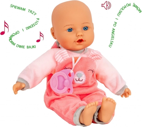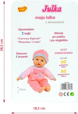 Julka parle et chante en polonais et en anglais (plus de 60 mots dans chaque langue) et raconte deux contes populaires : Le Petit Chaperon rouge et Boucle d’or et les trois ours. Jouer avec la poupée favorise la motricité fine, le jeu créatif et le sens des responsabilités lors des soins au bébé.