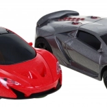 Le set contient deux voitures de course, une rouge et une grise, conçues comme des voitures de sport avec des spoilers marquants et des roues noires.
