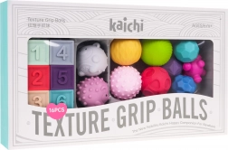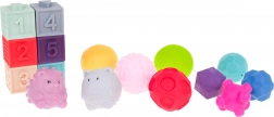 Le set comprend des cubes numérotés pour les premiers calculs et l’empilement, des balles souples richement texturées et deux animaux (hérisson et ourson) pour des jeux imaginatifs. Grâce au matériau souple, les jouets sont faciles à tenir même pour les plus petits et aident à entraîner la préhension et la coordination œil-main.
