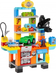 - pièces de construction de l’atelier, pont élévateur, «compresseur» pour gonfler les pneus, petite voiture, tournevis, 2× clé réglable, roue dentée, placards ouvrants, autocollants, notice