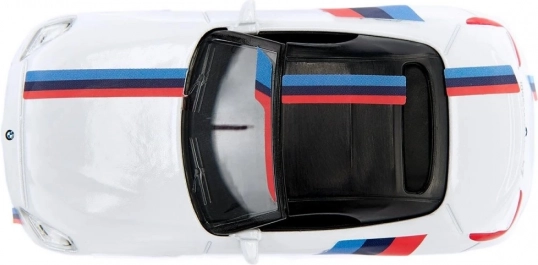 Une élégante petite voiture blanche inspirée du BMW Z4 M40ibandes sport bleues et rouges, sa finition détaillée et ses roues de qualité. Idéale à la fois comme jouet pour enfants et comme modèle de collection pour vitrine.