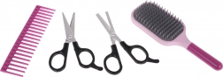 - sèche-cheveux, .- buse interchangeable pour sèche-cheveux avec diffuseur, .- buse interchangeable pour sèche-cheveux avec concentrateur, embout de focalisation, .- lisseur, .- ciseaux, .- ciseaux désépaississants, .- peigne, .- brosse à cheveux, .- support pour sèche-cheveux. | .